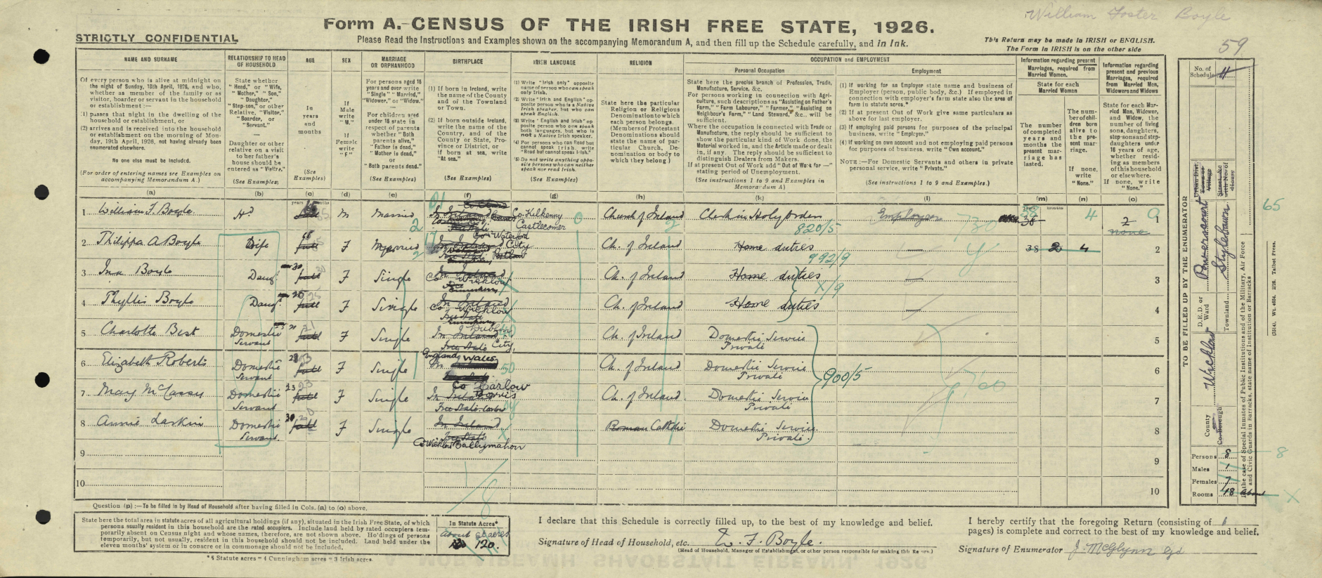 The return, signed by her father William J. Boyle, lists the family members and their roles within the home. While William is identified as a "Clerk in Holy Orders," the entry for Ina Boyle (37 years old at the time) shines a light on the professional struggles she faced 100 years ago in Ireland.